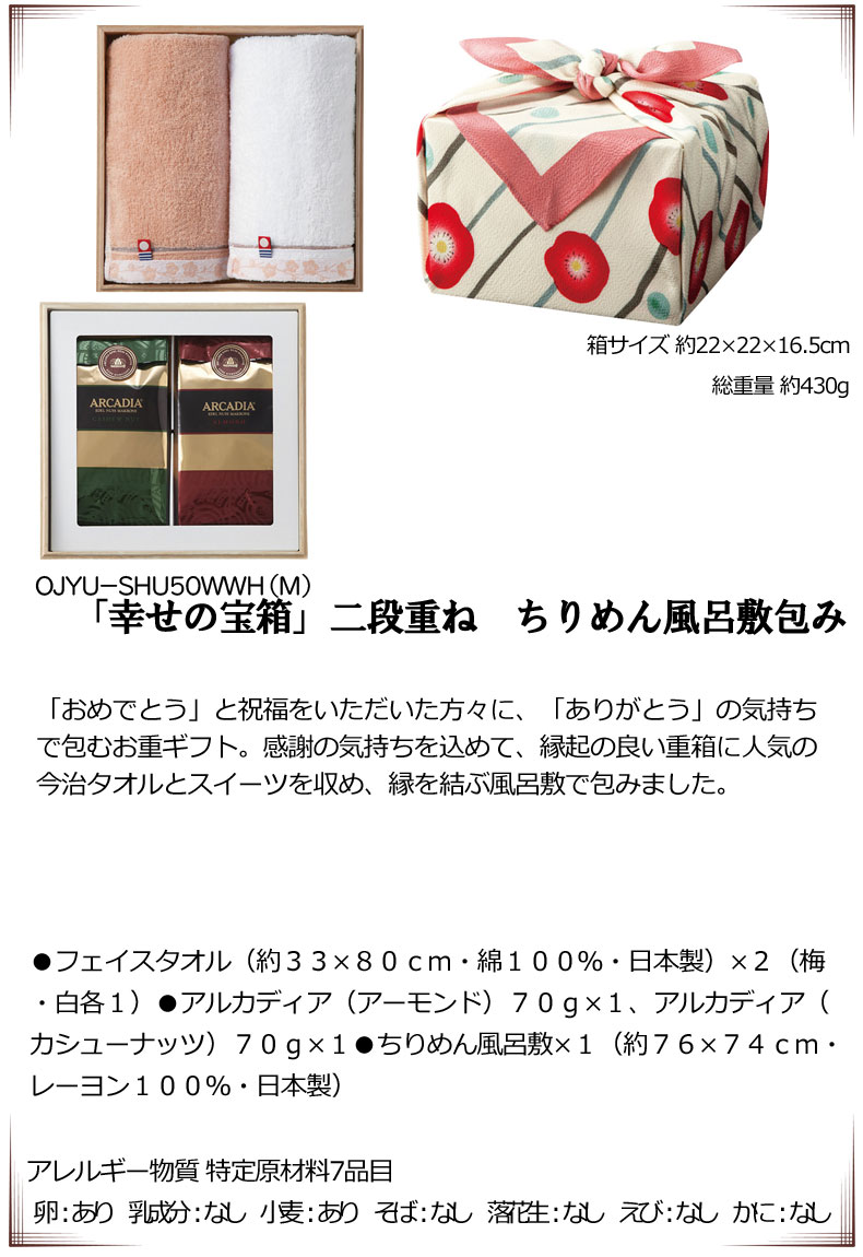 内祝 内祝い お祝い返し ウェディングギフト ブライダルギフト 引き出物 引出物 結婚引き出物 結婚引出物 結婚内祝い 出産内祝い 命名内祝い 入園内祝い 入学内祝い 卒園内祝い 卒業内祝い 就職内祝い 新築内祝い 引越し内祝い 快気内祝い 開店内祝い 二次会 披露宴 お祝い 御祝 結婚式 結婚祝い 出産祝い 初節句 七五三 入園祝い 入学祝い 卒園祝い 卒業祝い 成人式 就職祝い 昇進祝い 新築祝い 上棟祝い 引っ越し祝い 引越し祝い 開店祝い 退職祝い 快気祝い 全快祝い 初老祝い 還暦祝い 古稀祝い 喜寿祝い 傘寿祝い 米寿祝い 卒寿祝い 白寿祝い 長寿祝い 金婚式 銀婚式 ダイヤモンド婚式 結婚記念日 ギフト ギフトセット セット 詰め合わせ 贈答品 お返し お礼 御礼 ごあいさつ ご挨拶 御挨拶 プレゼント お見舞い お見舞御礼 お餞別 引越し 引越しご挨拶 記念日 誕生日 父の日 母の日 敬老の日 記念品 卒業記念品 定年退職記念品 ゴルフコンペ コンペ景品 景品 賞品 粗品 お香典返し 香典返し 志 満中陰志 弔事 会葬御礼 法要 法要引き出物 法要引出物 法事 法事引き出物 法事引出物 忌明け 四十九日 七七日忌明け志 一周忌 三回忌 回忌法要 偲び草 粗供養 初盆 供物 お供え お中元 御中元 お歳暮 御歳暮 お年賀 御年賀 残暑見舞い 年始挨拶 話題 のし無料 メッセージカード無料 ラッピング無料 手提げ袋無料 大量注文●フェイスタオル(約33×80cm・綿100%・日本製)×2(梅・白各1)●アルカディア(アーモンド)70g×1、アルカディア(カシューナッツ)70g×1●ちりめん風呂敷×1(約76×74cm・レーヨン100%・日本製) 箱サイズ 約22×22×16.5cm 総重量 約430g 卵:あり 乳成分:なし 小麦:あり そばなし 落花生:なし えび:なし かに:なし