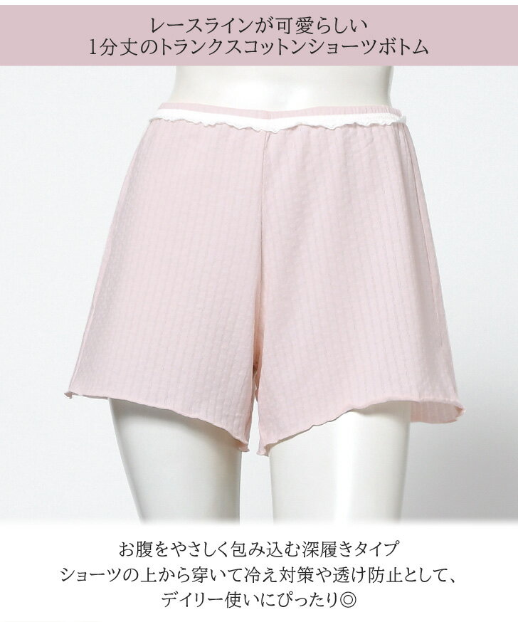 ●レースラインが可愛らしい1分丈のトランクスコットンショーツボトム お腹をやさしく包み込む深履きタイプ ショーツの上から穿いて冷え対策や透け防止として、デイリー使いにぴったり◎ クロッチが付いているので一枚履きも可能 コットン100%の柔らかでストレスフリーな履き心地 足口部分はゆったりしており締め付けないので、就寝時やリラックス時におすすめ! ★